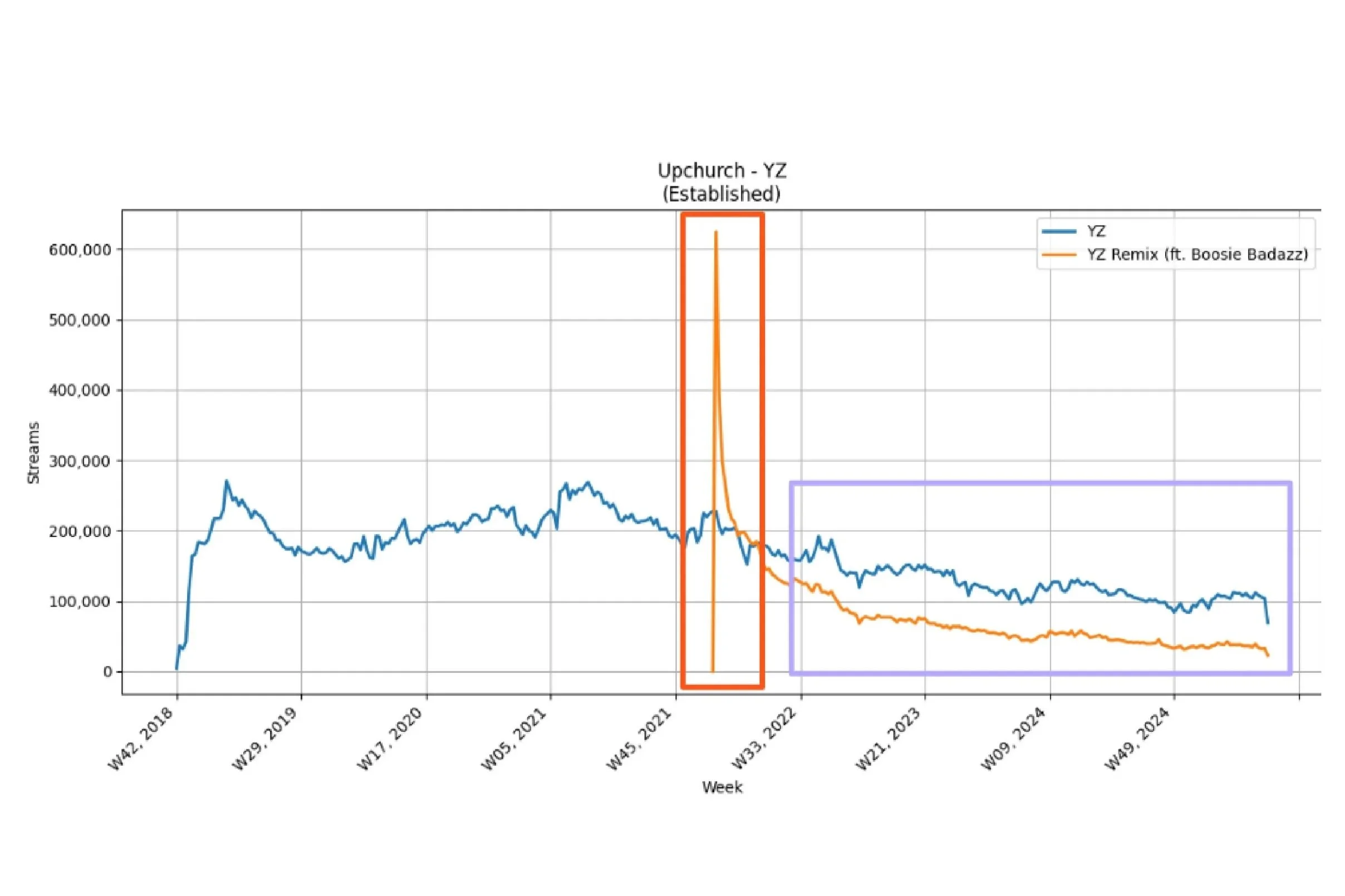 Remixes: Tracked lifecycle of remixes vs. originals (peak velocity, decay rate, effect on original’s streams).